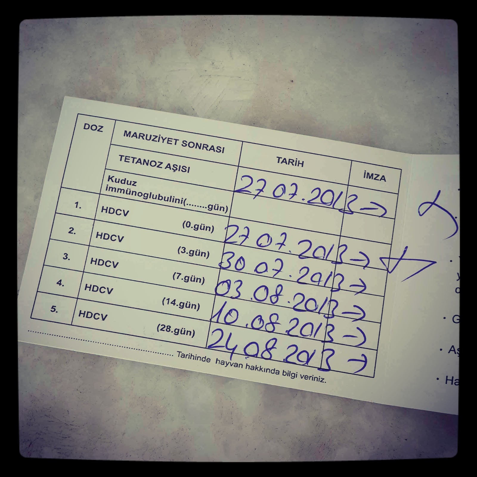 Şimdi, öncelikle köpek benimki gibi sahipsizse ve bir daha görme ihtimaliniz yok ise 1 doz tetanoz ve 5 doz kuduz aşısı oluyorsunuz. Tetanoz ile kuduz aşısının ilk dozu olayın gerçekleştiği ilk gün vuruluyor. Bu yüzden böyle bir olay yaşarsanız hemen doktora gidin, bir an önce aşılanın. Sonraki kuduz aşıları 3.,7.,14. ve 28. günlerde yapılıyor. Size bir aşı kartı veriyorlar, bu kartla aşı olman gereken gün gidip aşınızı olmak durumundasınız. Eğer gün atlarsanız Emniyet’e haber veriliyor ve polis ya da jandarma eşliğinde hastaneye alınıyorsunuz. Sonuçta siz toplum sağlığını tehdit eden bir insansınız. Kuduz aşısı eskisi gibi karından vurulmuyor, ki böylesini düşünmeniz saçma zaten yüz nakli yapılabilen bir tıp dünyasından söz ediyoruz karından aşı mı kalır. Özellikle tetanoz ve kuduz aşısının birlikte yapıldığı ilk gün kendinizi yormayın, duş almayın hatta mümkünse yatıp dinlenin. Zira vücudunuza zert edilen onca mikrop bünyenizi mahvedebilir. Bu arada sizi ısıran köpek 10 günün ardından ölmezse aşılara devam etmenize gerek yok; ama görme ihtimaliniz olmayan tanıyamayacağınız bir köpek tarafından ısırıldıysanız aşılarınızı tamamlamanızı öneririm. Aşı günlerinizden birinde şehir dışında bulunacaksanız (ben 4.aşımda İstanbul’da olmayacağım mesela) bulunduğunuz şehirdeki bir devlet hastanesinde aşınızı olup asıl hastanenize (benim örneğimde Haseki’ye) o gün içinde haber vermelisiniz. Yoksa onlar sizi aşınızı olmamış varsayıp emniyet zincirini çalıştıracaklardır.