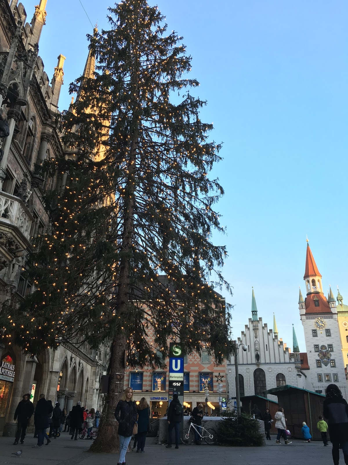 Marienplatz benim Münih’te en sevdiğim yer. Her seferinde kendine hayran bırakan, bir zamanlar belediye binasi olan ama artık AVM (evet bildiğiniz AVM) olarak kullanılan Rathaus binasinin görkemiyle büyüleneceksiniz, garanti veriyorum. Marienplatz’a Christmas zamanı Avrupa’daki en meşhur Christmaskindlemarkt’ı kuruluyor, cıvıl cıvıl ışıl ışıl ve daha bir çok ikileme sıfatı kullanabiliriz burası için.